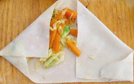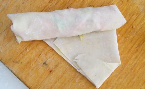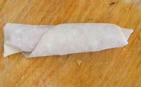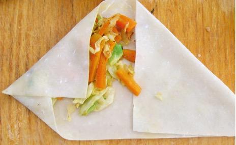- Placer une cuillerée de garniture sur le coin de la feuille de pâte et replier les bords longitudinaux. Enrouler.